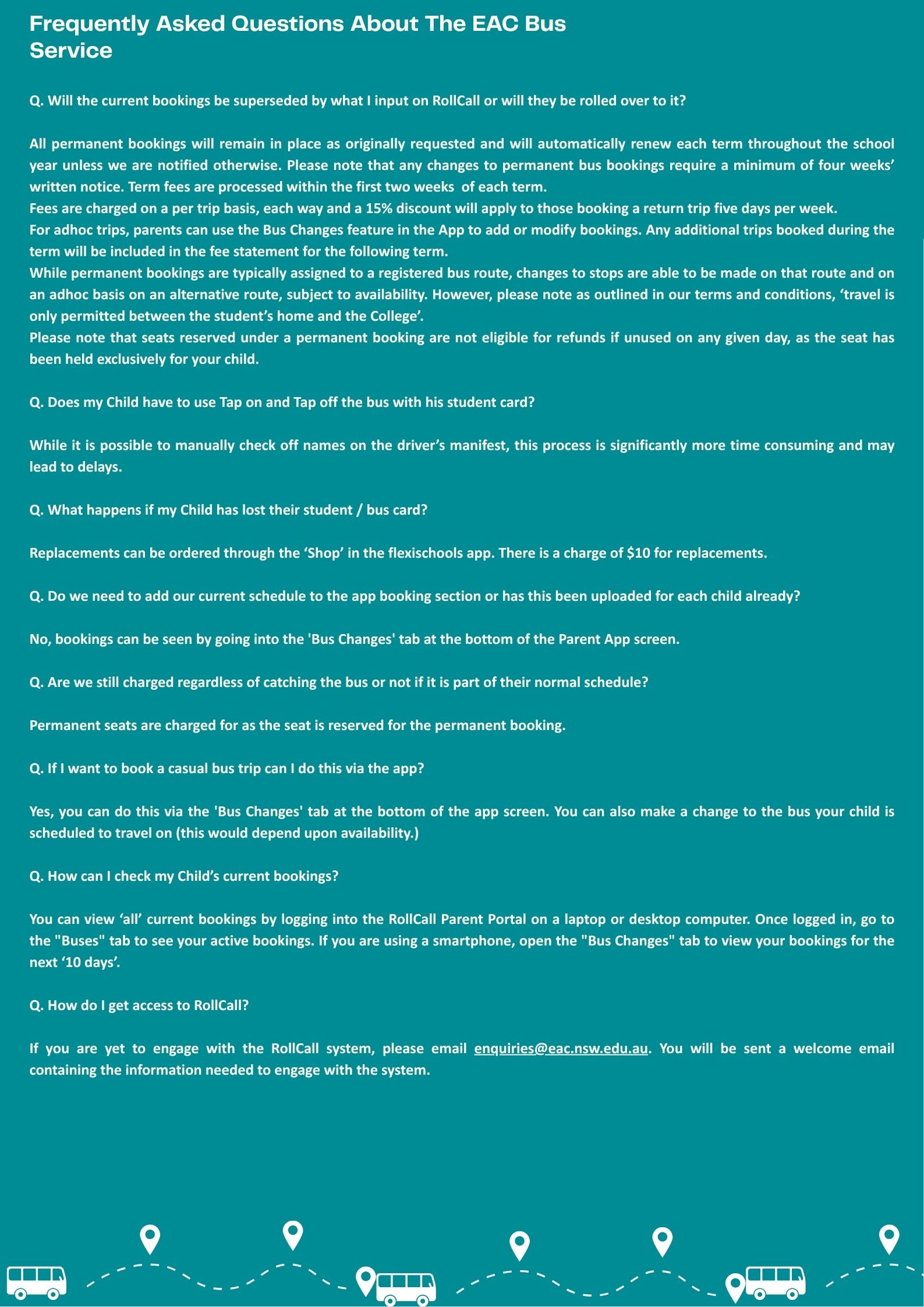 The College offers a bus service exclusively for Emmanuel students.  Designed to provide families with peace of mind, the service uses the RollCall bus management system where students tap on and off the bus similar to most public transport systems. Through the dedicated RollCall Parent App, families have instant visibility of their child’s journey, can view the bus location in real time, make casual booking changes and receive notifications or alerts about trip variations or delays.