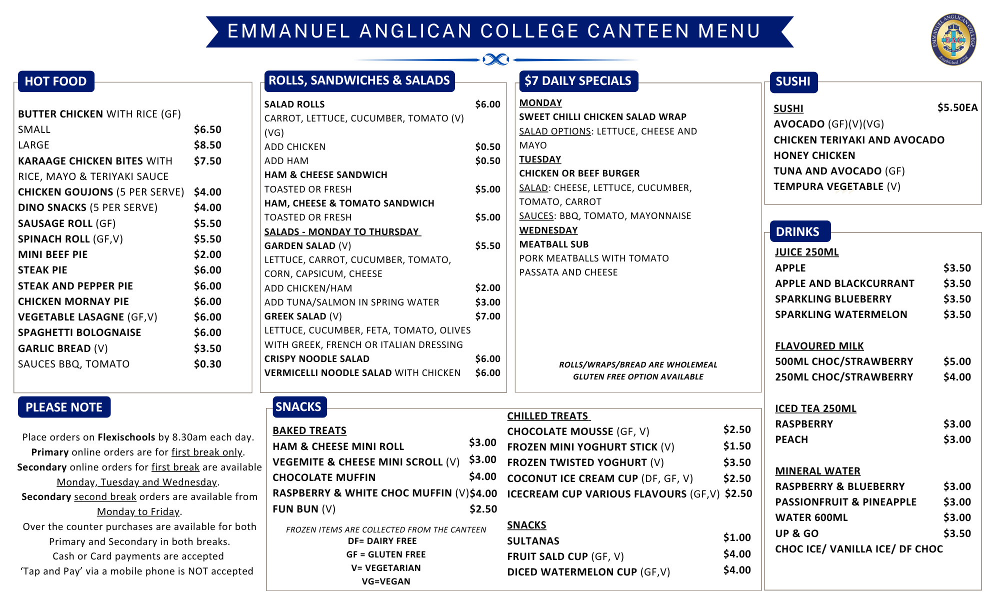 Orders can be placed online via the FlexiSchools app before 8:30am or submitted manually with a paper bag containing the student’s name, class, order details and correct cash payment. The order should be placed in the classroom Canteen Tub by 9:00am. All primary orders are delivered to classrooms at First Break.